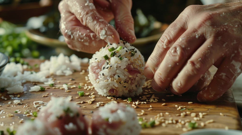 Arrange the rice balls on a serving platter. Serve alongside small dishes of soy sauce, wasabi paste, and pickled ginger. Garnish with extra sliced green onions for a pop of color and freshness.